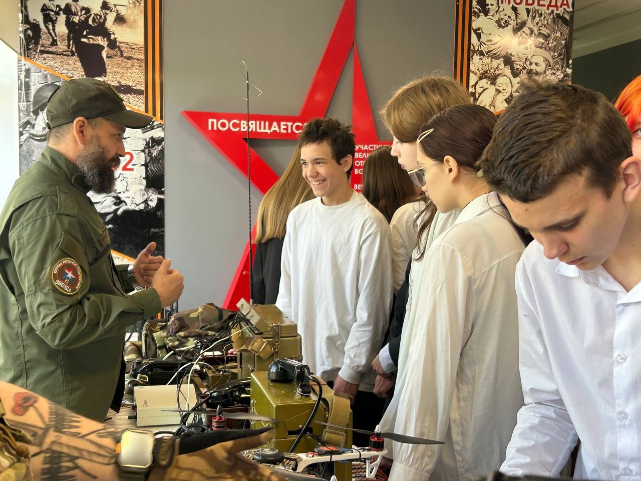 В зале развернулось захватывающее действо: занятие по основам военной подготовки, дополненное специализированной выставкой. Опытные наставники провели для учеников мастер-классы по связи, вооружению, экипировке, тактической медицине и инженерной подготовке, а также ответили на вопросы ребят.
